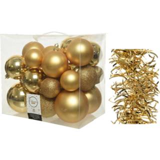 Kerstversiering kunststof kerstballen 6-8-10 cm met glitter folieslingers pakket goud van 28x stuks